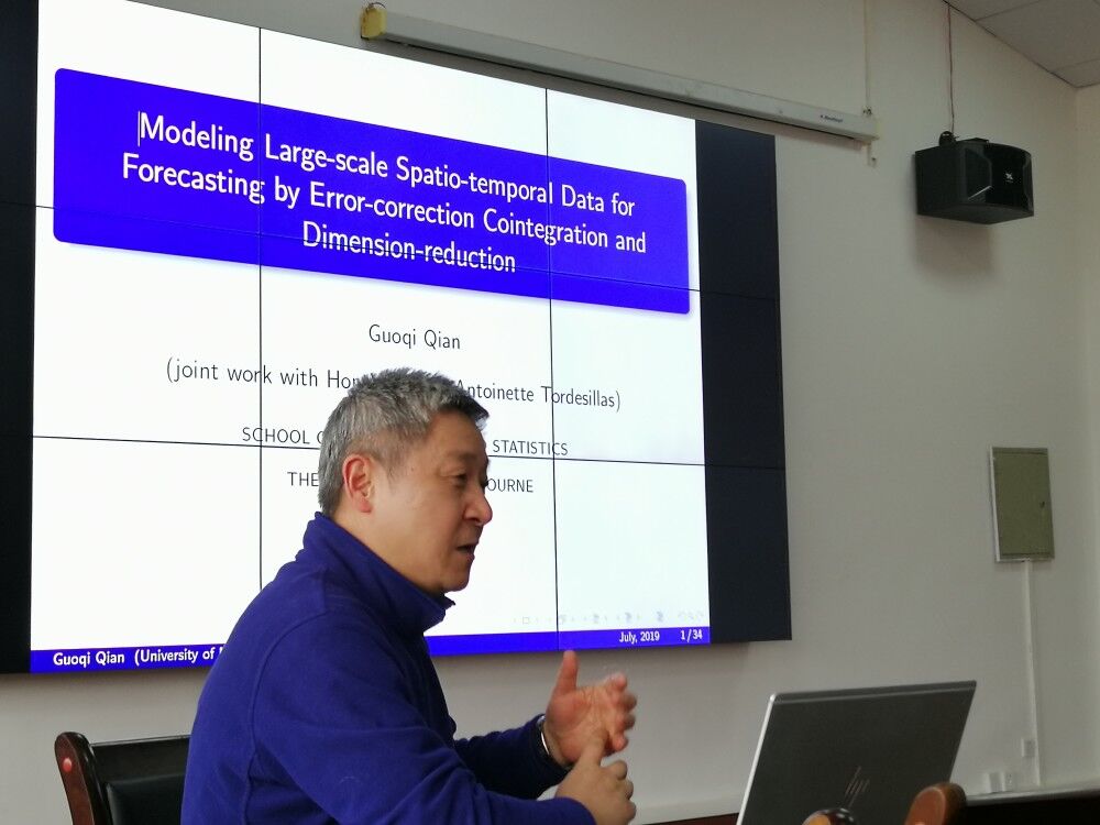 錢國(guó)祺教授于1987年在中國(guó)科學(xué)技術(shù)大學(xué)獲得學(xué)士學(xué)位,1994年在加拿大達(dá)爾豪斯大學(xué)獲博士學(xué)位,2009年至今在澳大利亞墨爾本大學(xué)任教。本次報(bào)告中,錢教授重點(diǎn)介紹了其團(tuán)隊(duì)最近開發(fā)的隨機(jī)時(shí)空協(xié)整框架,通過(guò)該框架可模擬高維非平穩(wěn)時(shí)空過(guò)程數(shù)據(jù)中的動(dòng)力學(xué)。這些數(shù)據(jù)在許多復(fù)雜系統(tǒng)現(xiàn)象的觀測(cè)中很常見(jiàn),例如滑坡和地震監(jiān)測(cè)中的地震動(dòng)數(shù)據(jù)。該研究成果為大規(guī)模和非平穩(wěn)時(shí)空數(shù)據(jù)分析中的建模、降維、估計(jì)和預(yù)測(cè)提供了新的見(jiàn)解。尤其是在滑坡預(yù)測(cè)方面,該研究為利用高時(shí)空維數(shù)據(jù)對(duì)滑坡未來(lái)動(dòng)力學(xué)進(jìn)行可靠預(yù)測(cè)提供了前提條件。