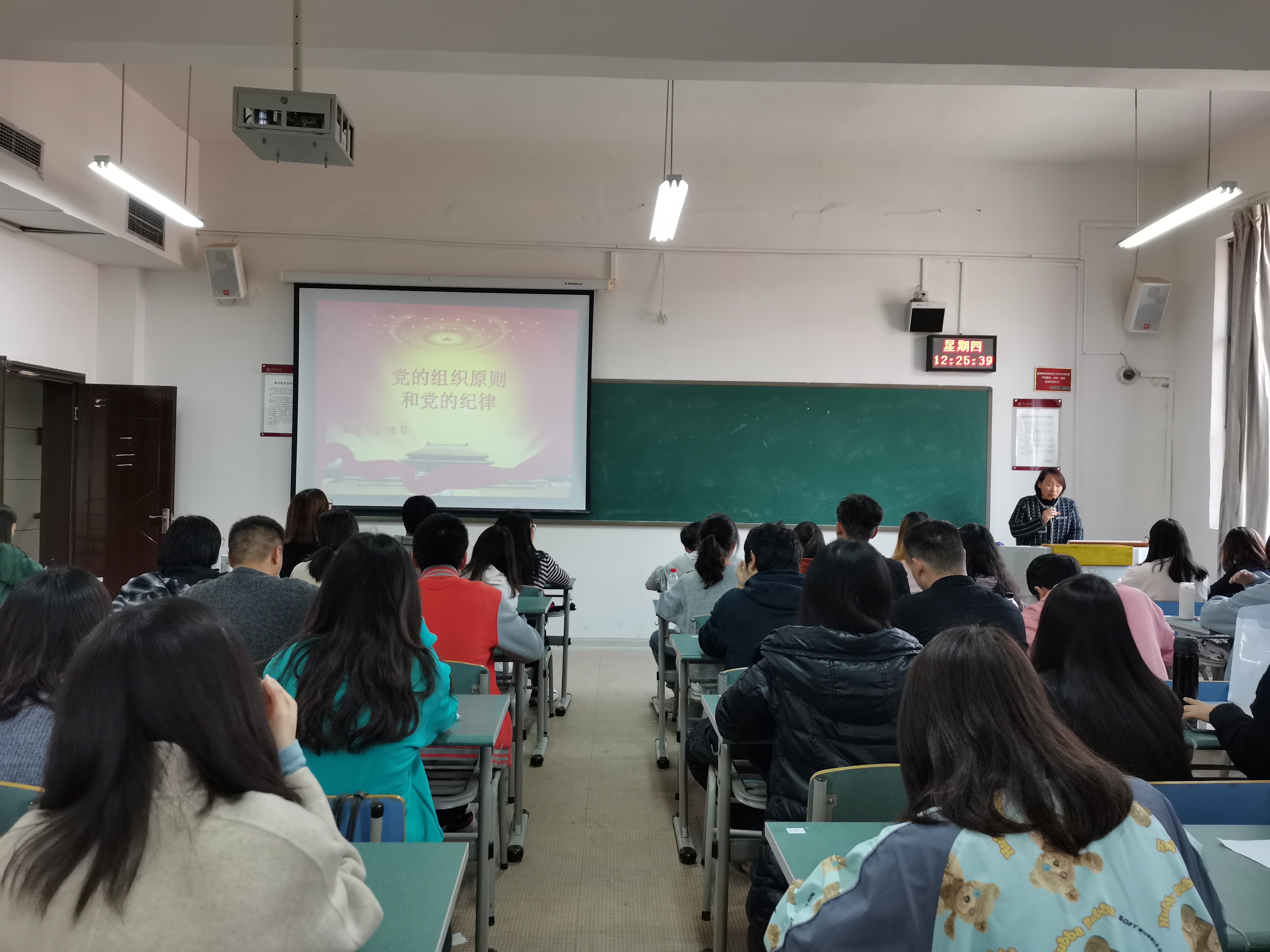 11月19日中午,信息學(xué)院黨委紀(jì)檢委員陳琴在志學(xué)樓414為信息學(xué)院入黨積極分子培訓(xùn)班的學(xué)員們上黨課,陳琴以“黨的組織原則和黨的紀(jì)律”為題作了精彩講授。