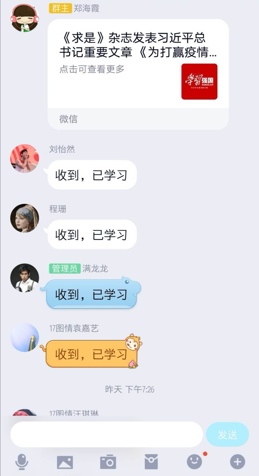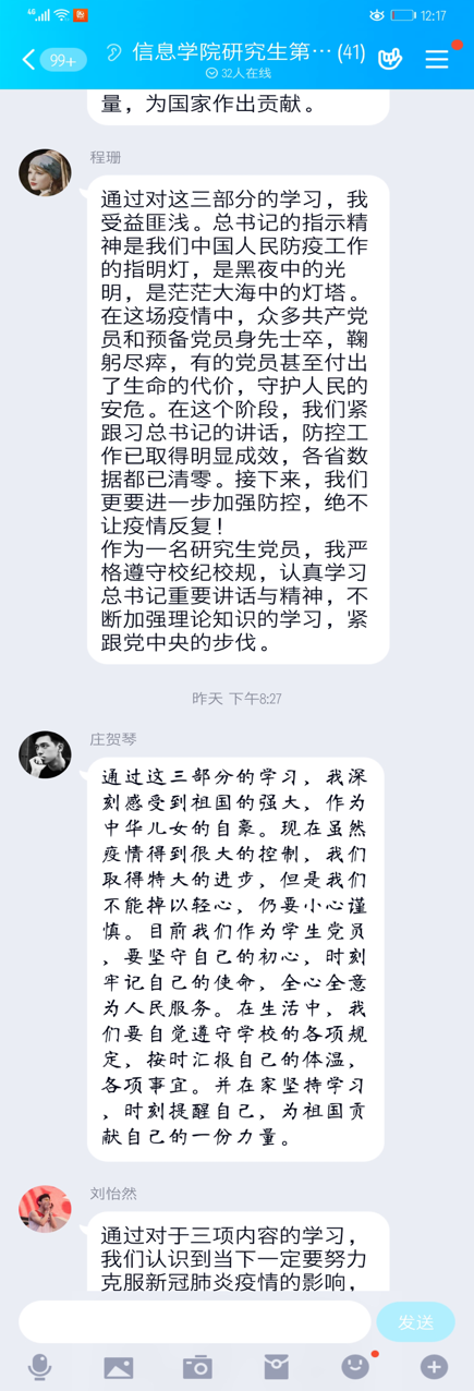 本網(wǎng)訊:(鄭海霞 圖文報道)2020年3月24日,信息學院研究生第一黨支部在支部QQ群召開線上黨員大會組織全體黨員學習。學習內(nèi)容為《習近平:在決戰(zhàn)決勝脫貧攻堅座談會上的講話》、《求是》雜志發(fā)表習近平總書記重要文章《為打贏疫情防控阻擊戰(zhàn)提供強大科技支撐》和《省委召開常委會會議暨省新冠肺炎疫情防控工作領導小組會議》。會議由支部書記鄭海霞主持,采取的學習形式為“書記領學-會上交流”。