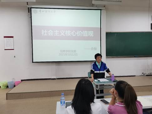 5月12日中午,我校特邀黨建組織員余敏老師在進學樓1-1教室為信息學院入黨積極分子培訓班學員們進行授課。余敏老師授課內(nèi)容為:“社會主義核心價值觀”。