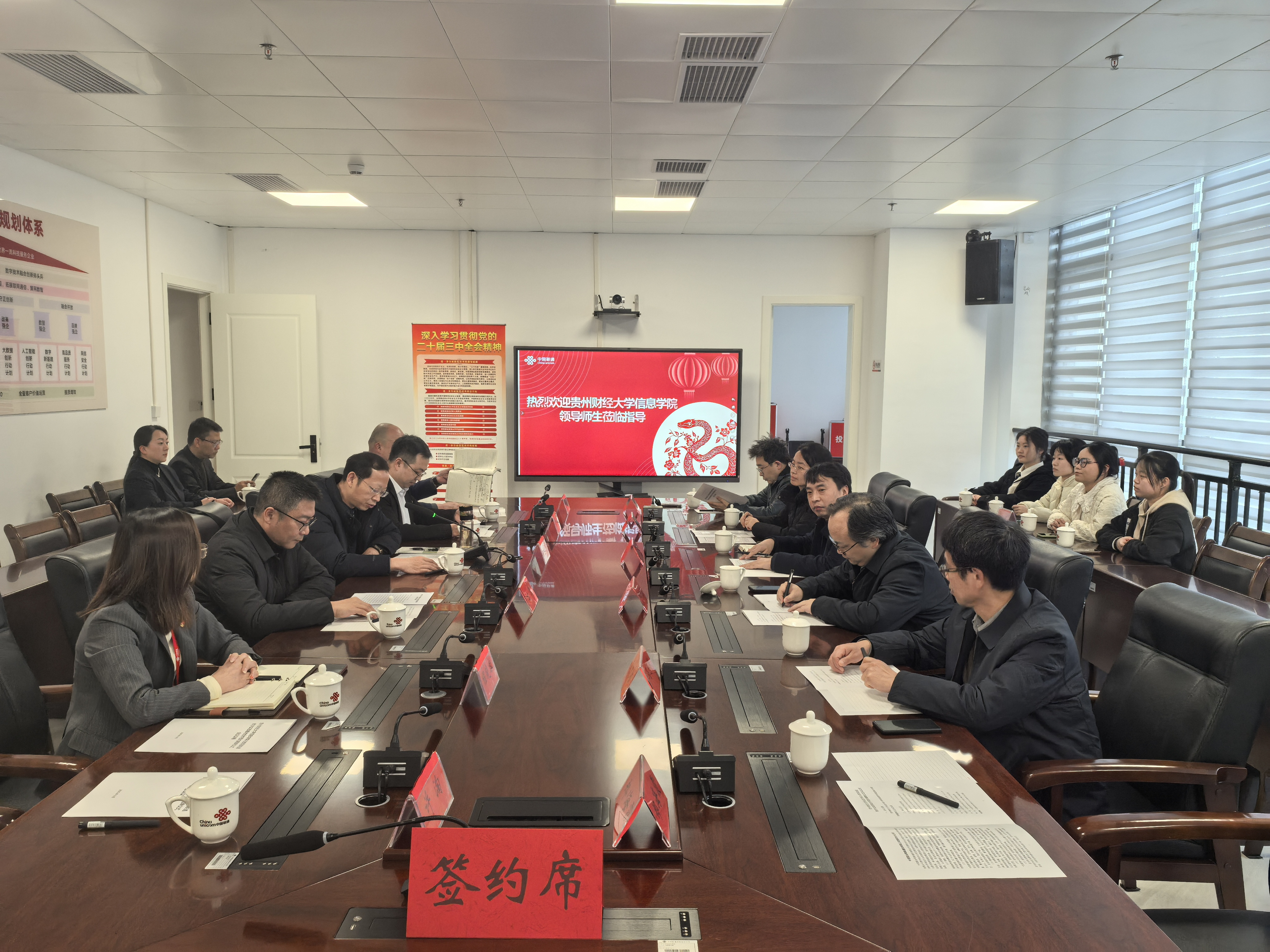 本網(wǎng)訊:(張駿 圖文報道)2025年3月4日,信息學(xué)院黨委副書記、院長鄧明森一行到貴陽大數(shù)據(jù)科創(chuàng)城算力中心參加中國聯(lián)合網(wǎng)絡(luò)通信有限公司貴陽分公司與信息學(xué)院校外實踐教學(xué)基地簽約授牌儀式。出席活動的還有中國聯(lián)通貴安新區(qū)分公司總經(jīng)理方恒以及政企事業(yè)部經(jīng)理程曉容、中國聯(lián)通貴陽分公司政企事業(yè)部副經(jīng)理陳安以及中國聯(lián)通貴安新區(qū)分公司教育行業(yè)總監(jiān)熊晨曦,信息學(xué)院黨委委員、副院長劉文江、信工系副主任馬思根、計科系副主任陳清容、學(xué)生科副科長鄭海霞、實驗實踐教學(xué)管理科張駿及畢業(yè)實習(xí)生代表,儀式由中國聯(lián)通貴陽分公司副總經(jīng)理譚峰主持。