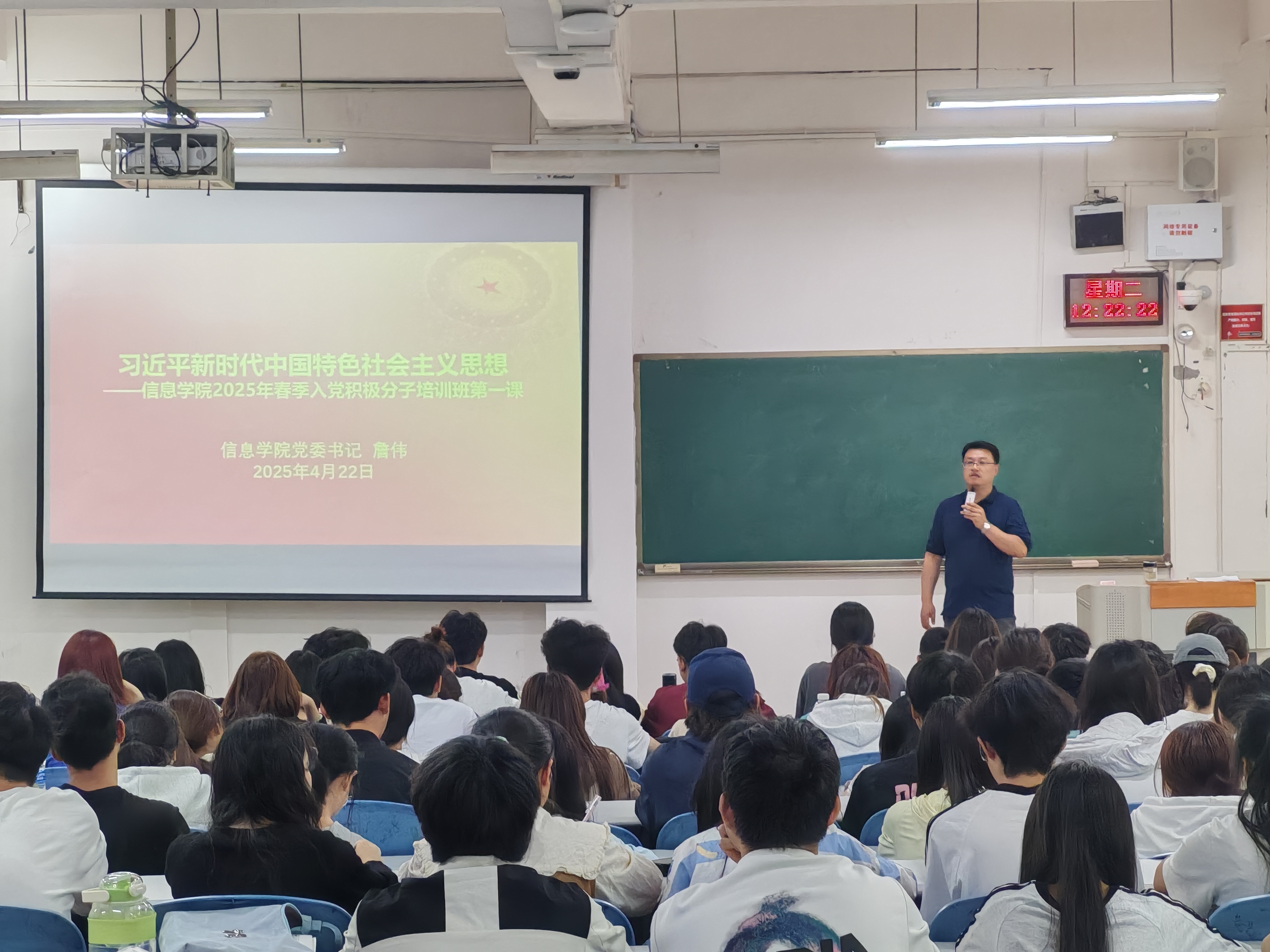 本網(wǎng)訊:(劉小浪 圖文報道)為加強入黨積極分子培養(yǎng)教育,幫助入黨積極分子深入學(xué)習(xí)黨的理論、路線、方針、政策,4月22日,信息學(xué)院黨校在進學(xué)樓101舉辦入黨積極分子培訓(xùn)班,學(xué)院黨委書記詹偉出席開班典禮并講授專題黨課。